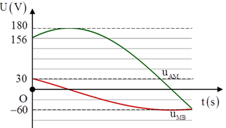 Đặt điện áp xoay chiều có tần số 50 Hz vào đầu đoạn mạch AB gồm: đoạn AM chứa điện trở thuần R= 90 Ω và tụ điện C= 35,4 µF;đoạn MB là hộp kín chứa hai trong ba phần tử mắc nối tiếp (điện trở thuần R0 , cuộn cảm L0, tụ điện C0). Đồ thị biểu diễn sự phụ thuộc vào thời gian của uAM và uMB như hình vẽ (chú ý \(90\sqrt 3 \approx 156\) ). Giá trị của các phần tử chứa trong hộp X là: