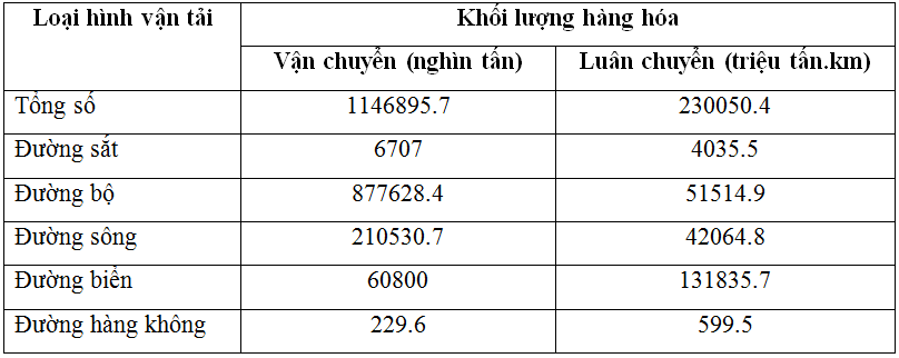 Cho bảng số liệu: Khối lượng hàng hóa vận chuyển và luân chuyển phân theo loại hình vận