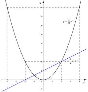 Cho hàm số: \(y = \frac{{{x^2}}}{2}\,\,\,\,(P),\,\,\,\,y = \frac{1}{2}x + 1\,\,\,(D).\)