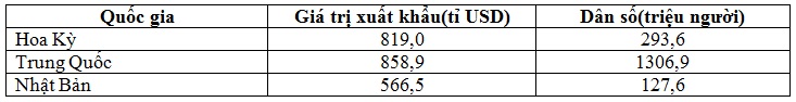 Cho bảng số liệu: Giá trị xuất khẩu và dân số của Hoa Kỳ,Trung Quốc, Nhật Bản năm