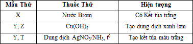 Tiến hành thí nghiệm với các chất hữu cơ X, Y, Z, T đều trong dung dịch. Kết quả được ghi ở bảng sau: