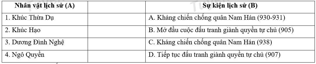 Nối cột (A) nhân vật lịch sử với cột (B) sự kiện lịch sử cho phù hợp về các cuộc đấu