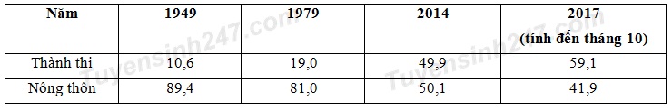 Dạng biểu đồ thích hợp nhất thể hiện sự chuyển dịch cơ cấu dân số nông thôn và thành thị của Trung Quốc giai đoạn 1949 - 2017 là