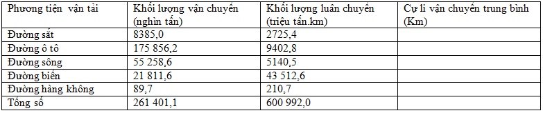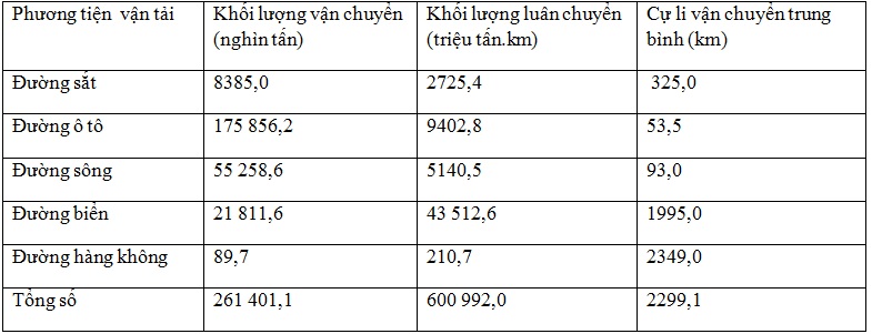 Cho bảng số liệu: KHỐI LƯỢNG VẬN CHUYỂN VÀ KHỐI LƯỢNG LUÂN CHUYỂN CỦA CÁC PHƯƠNG TIỆN