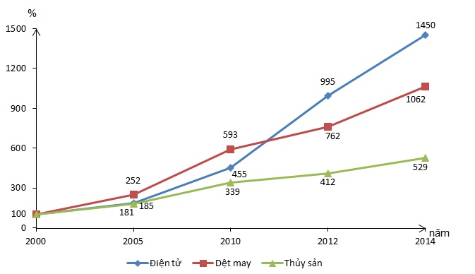 Nhìn vào biểu đồ đã cho, trong giai đoạn 2000-2014, mặt hàng xuất khẩu có tốc độ tăng trưởng lớn nhất là: