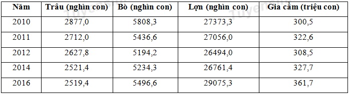 Cho bảng số liệu SỐ LƯỢNG GIA SÚC, GIA CẦM NƯỚC TA GIAI ĐOẠN 2010 – 2016 (Nguồn: Niên giám