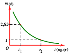 Hình bên là đồ thị biểu diễn khối lượng hạt nhân của một chất phóng xạ X phụ thuộc