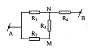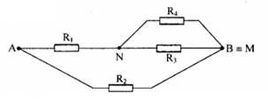 R1 = R2 = R3 = 6W, R4 = 2W. Tính điện trở tương đương của mạch khi ta nối M và B bằng một ampe kế có điện trở rất nhỏ?