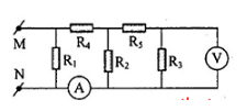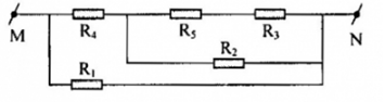 Cho mạch điện như hình vẽ: UMN = 4V, R1 = R2 = 2W, R3 = R4 = R5 = 1W, RA = 0, RV = ∞. Số chỉ của