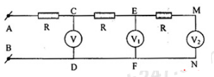 Cho mạch điện như hình vẽ Biết 3 vôn kế giống nhau, UV = 5V, UV2 = 2V. Số chỉ của vôn kế V1