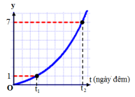 Một mẫu chất phóng xạ \(Po210\) nguyên chất có chu kì bán rã 138 ngày đêm phát ra tia phóng xạ \(\alpha \) và biến thành hạt nhân chì \(Pb206\) bền. Gọi \(y\) là tỉ số giữa số hạt nhân chì tạo thành và số hạt nhân \(Po210\) còn lại trong mẫu. Hình bên là đồ thị biểu diễn sự phụ thuộc của \(y\) theo thời gian \(t\). Khoảng thời gian \(t = {t_2}-{t_1}\) gần bằng