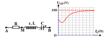 Đặt một điện áp xoay chiều vào hai đầu một đoạn mạch AB như hình vẽ, trong đó cuộn dây có r là điện trở và L hệ số tự cảm; tụ điện có điện dung C thay đổi được. Điều chỉnh C thì thấy điện áp hiệu dụng hai đầu đoạn mạch MB phụ thuộc vào dung kháng ZC của tụ điện như đồ thị hình bên. Tỉ số R/r bằng