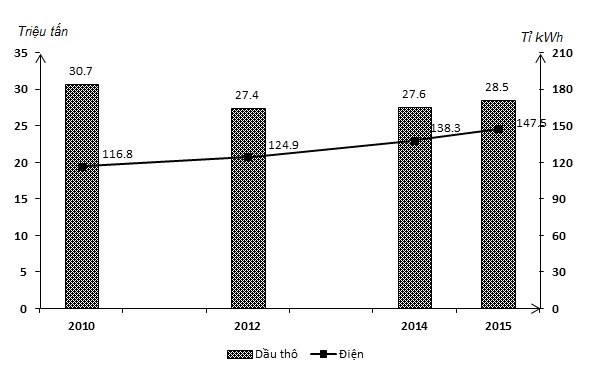 Cho biểu đồ về dầu thô và điện của Ma-lai-xi-a, giai đoạn 2010 - 2015:
