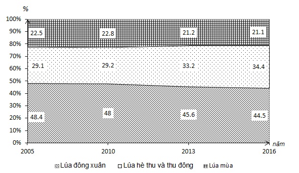 Theo biểu đồ, nhận xét nào sau đây không đúng về sự thay đổi tỉ trọng trong cơ cấu sản lượng lúa phân theo mùa vụ của nước ta, giai đoạn 2015 - 2016?