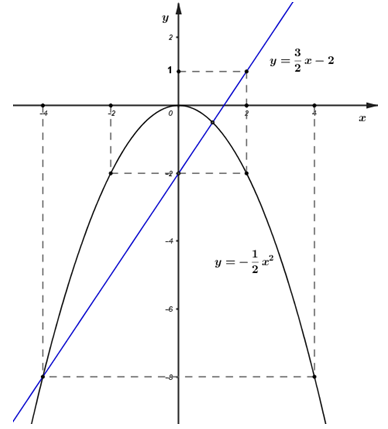 Cho hàm số: \(\left( P \right):\,\,y = \frac{{ - {x^2}}}{2},\,\,\,\left( d \right):\,\,y = \frac{3}{2}x - 2.\)