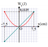 Một con lắc lò xo có đầu trên treo vào một điểm cố định, đầu dưới gắn vào một vật nặng dao động điều hòa theo phương thẳng đứng tại nơi có gia tốc trọng trường g = 10 m/s2. Chọn mốc thế năng tại vị trí cân bằng của con lắc. Hình vẽ bên là đồ thị biểu diễn sự phụ thuộc của thế năng hấp dẫn và thế năng của con lắc theo li độ x. Chu kì dao động điều hòa của vật gần bằng