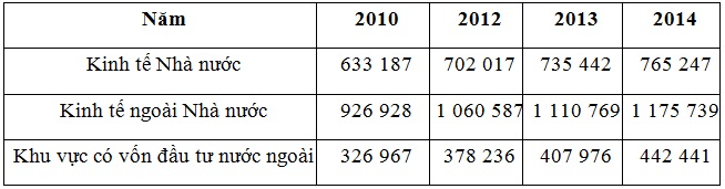 Căn cứ vào bảng số liệu, cho biết nhận xét nào sau đây không đúng về tổng sản phẩm trong nước phân theo thành phần kinh tế của nước ta, giai đoạn 2010 -2014?