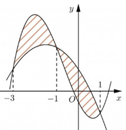 Cho hai hàm số \(f(x) = a{x^3} + b{x^2} + cx - \dfrac{1}{2}\) và \(g(x) = d{x^2} + ex + 1\) \((a,b,c,d,e \in \mathbb{R})\). Biết rằng đồ thị của hàm số \(y = f(x)\) và \(y = g(x)\) cắt nhau tại ba điểm có hoành độ lần lượt là \( - 3; - 1;1\) (tham khảo hình vẽ). Hình phẳng giới hạn bởi hai đồ thị đã cho có diện tích bằng