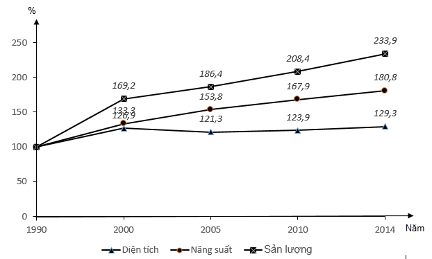 Căn cứ vào biểu đồ, cho biết nhận xét nào sau đây không đúng về tốc độ tăng trưởng diện tích, năng suất và sản lượng lúa của nước ta, giai đoạn 1990-2014?