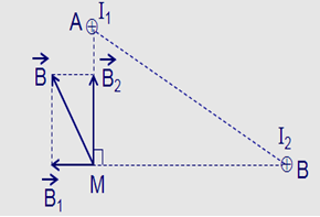 Hai dây dẫn thẳng, rất dài, đặt song song, cách nhau \(10cm\) trong không khí, có hai dòng điện cùng chiều, có cường độ \({I_1} = 9A;{I_2} = 16A{\rm{ }}\) chạy qua. Xác định cảm ứng từ tổng hợp do hai dòng điện này gây ra tại điểm \(M\) cách dây dẫn mang dòng \({I_{1}}\,\,\,6cm\) và cách dây dẫn mang dòng \({I_{2}}\,\,8cm\)?