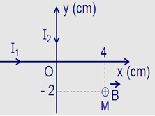 Hai dây dẫn thẳng, rất dài, đặt trong không khí, trùng với hai trục tọa độ vuông góc \(xOy\). Dòng điện qua dây \(Ox\) chạy cùng chiều với chiều dương của trục tọa độ và có cường độ \({I_{1}} = 2A\), dòng điện qua dây \(Oy\) chạy ngược chiều với chiều dương của trục tọa độ và có cường độ \({I_{2}} = 3A\). Xác định cảm ứng từ tổng hợp do hai dòng điện này gây ra tại điểm \(M\) có tọa độ \(x = 4cm\) và \(y = - 2cm\).