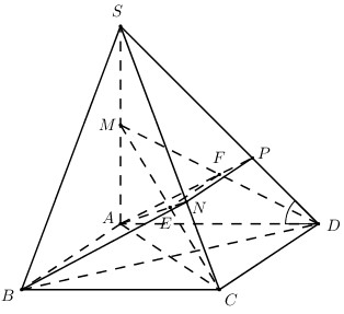 Cho hình chóp\(S.ABCD\) có đáy \(ABCD\) là hình vuông cạnh\(a,\) \(SA \bot \left( {ABCD} \right)\) và góc giữa \(SD\)với mặt đáy bằng \({45^{\rm{o}}}.\) Gọi \(M,N,P\) lần lượt là các điểm trên cạnh \(SA,SC,SD\) sao cho \(SM = MA,\)\(SN = 2NC\) và \(SP = 2PD.\)