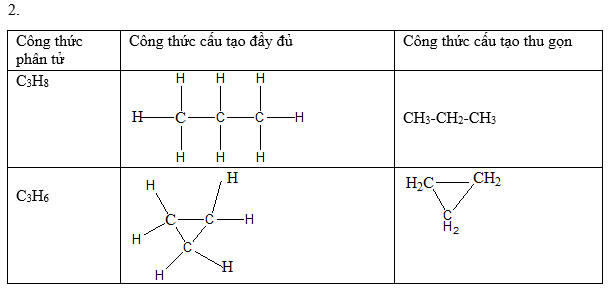 2. Viết công thức cấu tạo (đầy đủ và thu gọn) của các chất có công thức phân tử sau: C3H8, C3H6 (mạch vòng).