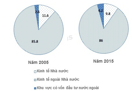Theo biểu đồ, nhận xét nào sau đây đúng về sự thay đổi tỉ trọng trong cơ cấu lao động phân theo thành phần kinh tế của nước ta năm 2015 so với năm 2005?