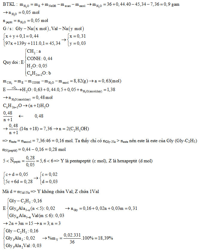 Hỗn hợp E gồm 3 chất: X (là este của amino axit); Y và Z là hai peptit mạch hở, hơn kém nhau 1 nguyên tử nitơ (đều chứa ít nhất hai loại gốc amino axit, MY < MZ). Cho 36 gam E tác dụng vừa đủ với 0,44 mol NaOH, thu được 7,36 gam ancol no, đơn chức, mạch hở và 45,34 gam ba muối của glyxin, thu được CO2, N2 và 1,38 mol H2O. Phần trăm khối lượng của Y trong E là