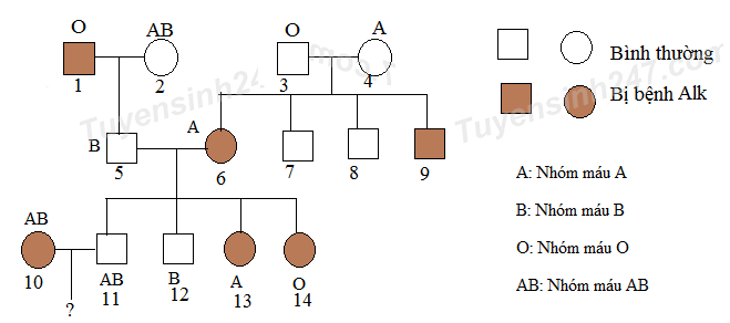 Bệnh Alkan niệu là bệnh di truyền hiếm gặp do 1 gen có 2 alen quy định. Gen gây bệnh Alkan niệu liên kết với gen I mã hóa cho hệ nhóm máu ABO (nhóm máu A có kiểu gen IAIA, IAIO; nhóm máu B có kiểu gen IBIB, IBIO; nhóm máu O có kiểu gen IOIO; nhóm máu A có kiểu gen IAIB) và khoảng cách giữa hai gen này là 11cM. Theo dõi sự di truyền của các tính trạng này trong một gia đình người ra lập được sơ đồ phả hệ sau, trong các phát biểu dưới đây có bao nhiêu phát biểu đúng? Biết rằng không phát sinh đột biến mới ở tất cả các cá thể trong phả hệ.