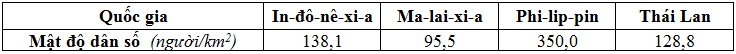 Theo bảng số liệu, nhận xét nào sau đây không đúng khi so sánh mật độ dân số của một số quốc gia