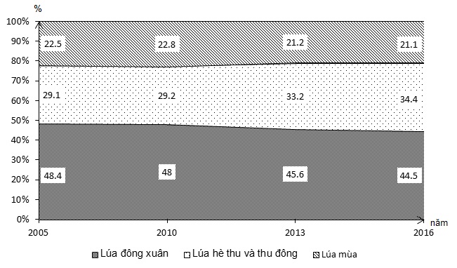 Theo biểu đồ, nhận xét nào sau đây không đúng về sự thay đổi tỉ trọng trong cơ cấu sản lượng lúa phân theo mùa vụ của nước ta, giai đoạn 2005 - 2016?