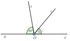 Cho góc bẹt \(\angle xOy\). Trên cùng một nửa mặt phẳng bờ \(xy\) kẻ hai tia \(Oz\) và \(Ot\) sao cho \(\angle xOz = {50^0}\) và góc \(\angle yOt = {80^0}\).