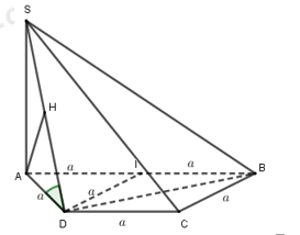 Cho hình chóp \(S.ABCD\) có đáy \(ABCD\) là hình thang cân, đáy lớn \(AB.\) Biết rằng\(AD = DC = CB = a\) , \(AB = 2a\) , cạnh bên \(SA\) vuông góc với đáy và mặt phẳng \(\left( {SBD} \right)\) tạo với đáy góc \({45^o}.\) Gọi \(I\) là trung điểm của cạnh \(AB.\) Tính khoảng cách \(d\) từ\(\;I\) đến mặt phẳng \(\left( {SBD} \right).\)