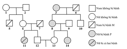 Phả hệ ở hình dưới đây mô tả sự di truyền 2 bệnh ở người: Bệnh P do một trong hai alen của một gen trên NST thường quy định; bệnh M do một trong hai alen của một gen nằm ở vùng không tương đồng trên nhiễm sắc thể giới tính X quy định. Biết rằng không xảy ra đột biến. Theo lí thuyết, có bao nhiêu phát biểu sau đây đúng?