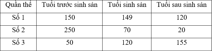 Trong 3 hồ cá tự nhiên, xét 3 quần thể của cùng một loài, số lượng cá thể của mỗi nhóm tuổi ở mỗi quần thể như sau: