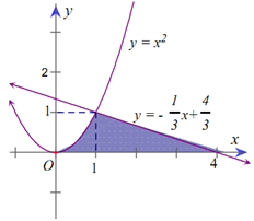 Tính diện tích hình phẳng giới hạn bởi các đường \(y = {x^2},\,\,y = - \frac{1}{3}x + \frac{4}{3}\) và trục hoành như hình vẽ.