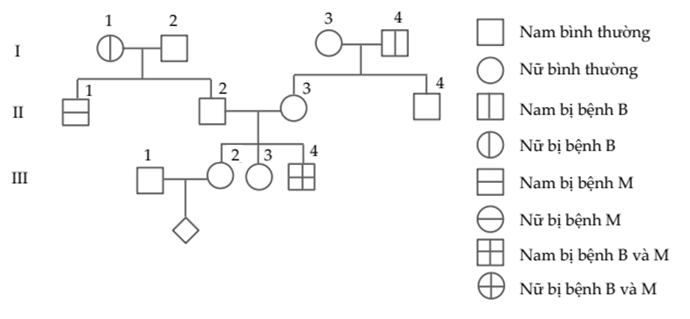 Phả hệ ở hình dưới đây mô tả sự di truyền bệnh B và M. Bệnh B do một trong hai alen của