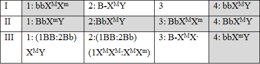 III. Biết bên gia đình của người chồng III.1 chỉ có em trai bị cả hai bệnh B và M, những người còn lại trong gia đình đều bình thường. Xác suất sinh con trai bình thường của cặp III.1 và III.2 là 1/8