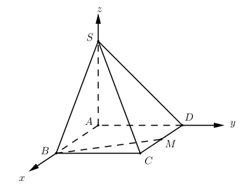 Đặt hệ trục tọa độ. Sử dụng công thức tính khoảng cách giữa hai đường thẳng chéo nhau \(d\left( {SC;BM} \right) = \dfrac{{\left| {\left[ {\overrightarrow {SC} ;\overrightarrow {BM} } \right].\overrightarrow {SB} } \right|}}{{\left| {\left[ {\overrightarrow {SC} ;\overrightarrow {BM} } \right]} \right|}}\).