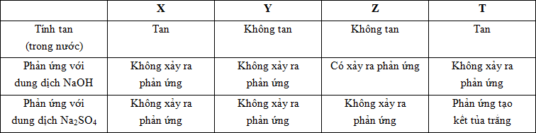 Các hidroxit: Ba(OH)2, NaOH, Al(OH)3, Fe(OH)3 được kí hiệu ngẫu nhiên là X, Y, Z, T. Kết quả thí nghiệm của X, Y, Z, T được ghi ở bảng sau: