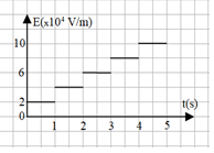 Một con lắc lò xo nằm ngang trên mặt phẳng bằng nhựa trơn nhẵn. Lò xo nhẹ, không dẫn điện có độ cứng k = 40N/m. Vật nhỏ tích điện q = 8.10-5C, có khối lượng m = 160g. Lấy g = 10m/s2 và π2 = 10. Hệ đang đứng yên thì người ta thiết lập một điện trường đều có đường sức cùng phương với trục lò xo và hướng theo chiều giãn của lò xo. Độ lớn cường độ điện trường phụ thuộc thời gian được mô tả bằng đồ thị hình vẽ bên. Sau 5s kể từ lúc bắt đầu chuyển động, vật đi được quãng đường S bằng
