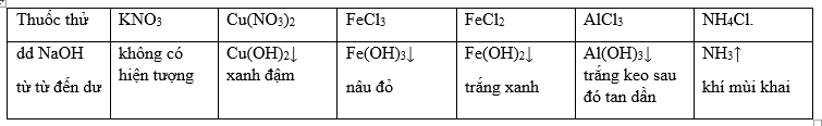 Có 6 lọ mất nhãn đựng các dụng dịch: KNO3, Cu(NO3)2, FeCl3, FeCl2, AlCl3, NH4Cl. Có thể dùng hóa chất nào sau đây để nhận biết các dung dịch trên?