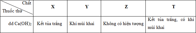 Dựa vào hiện tượng đặc trưng thu được của các chất với thuốc thử tìm được các chất X, Y, Z, T tương ứng.