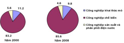 Biểu đồ thể hiện cơ cấu giá trị sản lượng công nghiệp phân theo ngành ở nước ta trong năm 2000 và 2008 (Đơn vị: %)