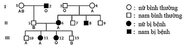 III. Cặp vợ chồng II5 – II6 và bốn đứa con của họ (10, 11, 12, 13) thì có 5 người mang kiểu gen dị hợp về tính trạng nhóm máu.