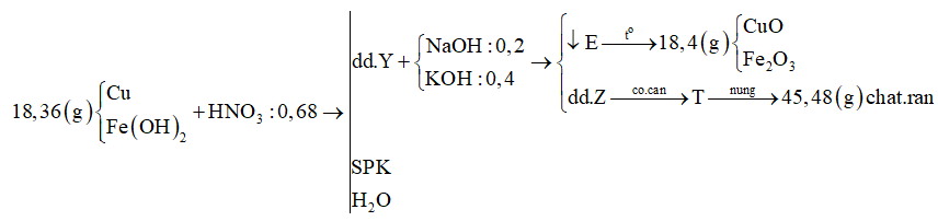 Hòa tan hết 18,36 gam hỗn hợp gồm Cu và Fe(OH)2 vào 95,2 gam dung dịch HNO3 45% thu được dung dịch Y (không chứa muối amoni). Cho Y phản ứng với 200 ml dung dịch NaOH 1M và KOH 2M, thu được kết tủa E và dung dịch Z. Nung E trong không khí đến khối lượng không đổi thu được hỗn hợp 18,4 gam hỗn hợp gồm CuO và Fe2O3. Cô cạn dung dịch Z, thu được hỗn hợp chất rắn khan T. Nung T đến khối lượng không đổi, thu được 45,48 gam hỗn hợp chất rắn khan. Nồng độ phần trăm của Fe(NO3)3 trong Y có giá trị gần nhất với giá trị nào sau đây?