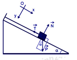 Vật rắn có khối lượng 2kg nằm cân bằng trên mặt phẳng nghiêng góc \(\alpha = {30^0}\). Lực căng dây có giá trị là bao nhiêu? Lấy \(g = 9,8m/{s^2}\) và bỏ qua masát.