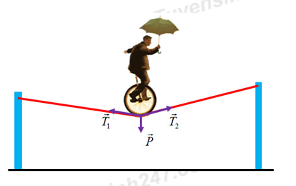 Một diễn viên xiếc (coi là một vật rắn) có trọng lượng 800N đi xe đạp một bánh trên dây làm dây võng xuống một góc \({120^0}\). Lực căng của dây treo có giá trị là bao nhiêu khi diễn viên xiếc đứng cân bằng? Coi dây không giãn.