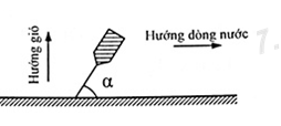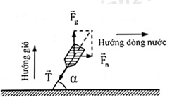 Một chiếc thuyền nằm trên bờ sông như hình vẽ. Biết \(\alpha = {60^0}\), lực căng của dây \(T = 100N\). Lực do gió và nước tác dụng lên thuyền có giá trị: